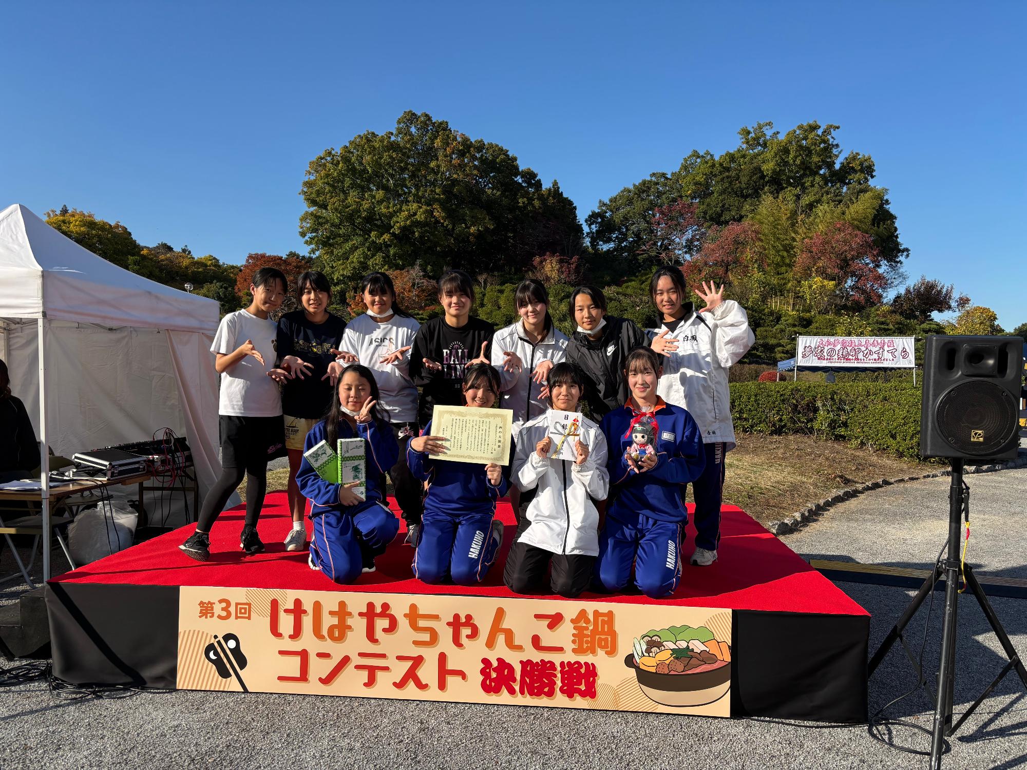 第3回葛城市ちゃんこ鍋コンテストに今年も本校女子バスケットボールチームが出場しています。1次審査を通過し、2次審査で阿古市長をはじめ審査員の皆さまに実食していただき、結果を待ちます。決勝戦が11月16日(日曜日)10:00より屋敷山公園周辺で開催されます。昨年の東の大関賞から今年は横綱賞を目指します。