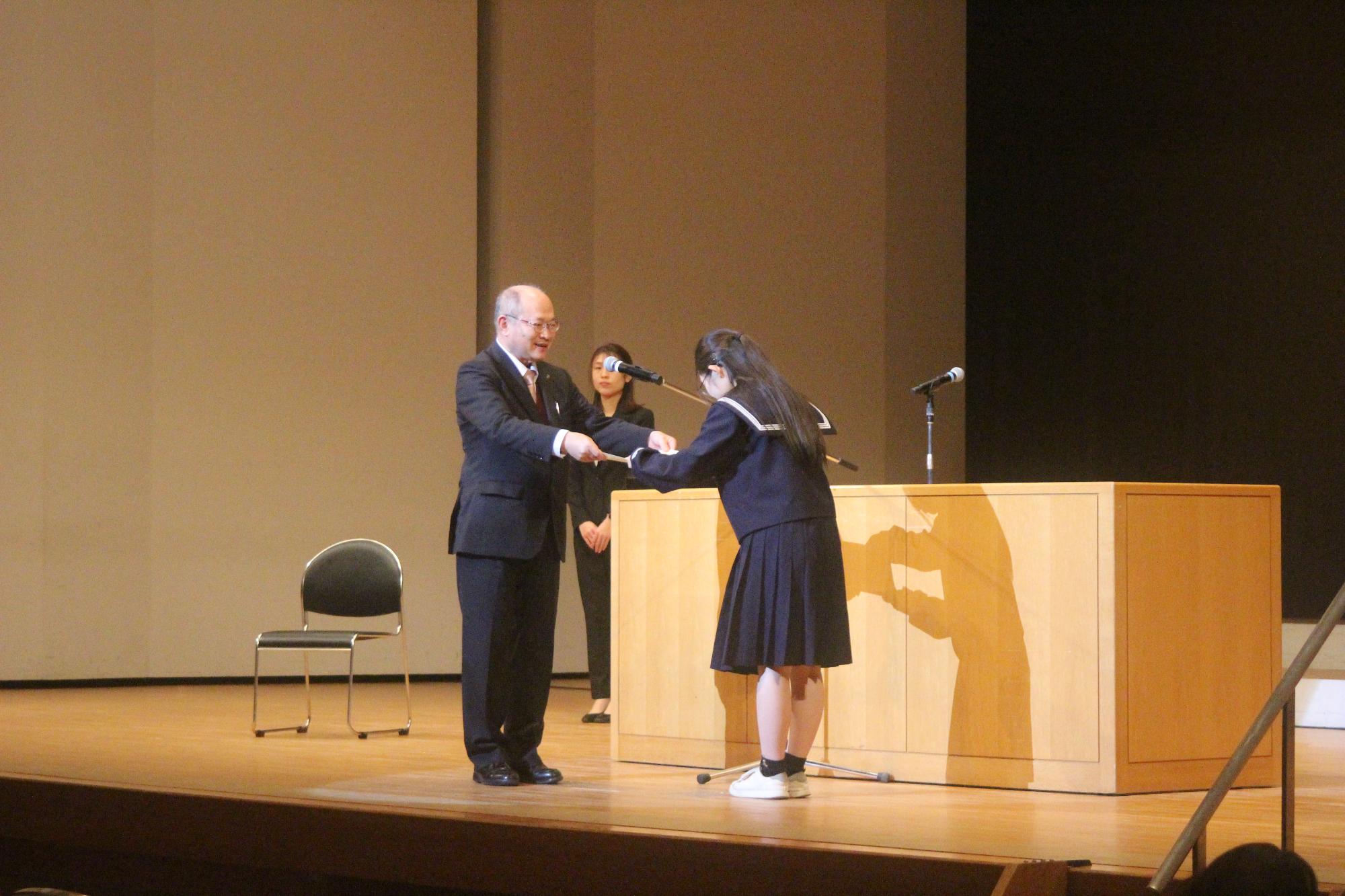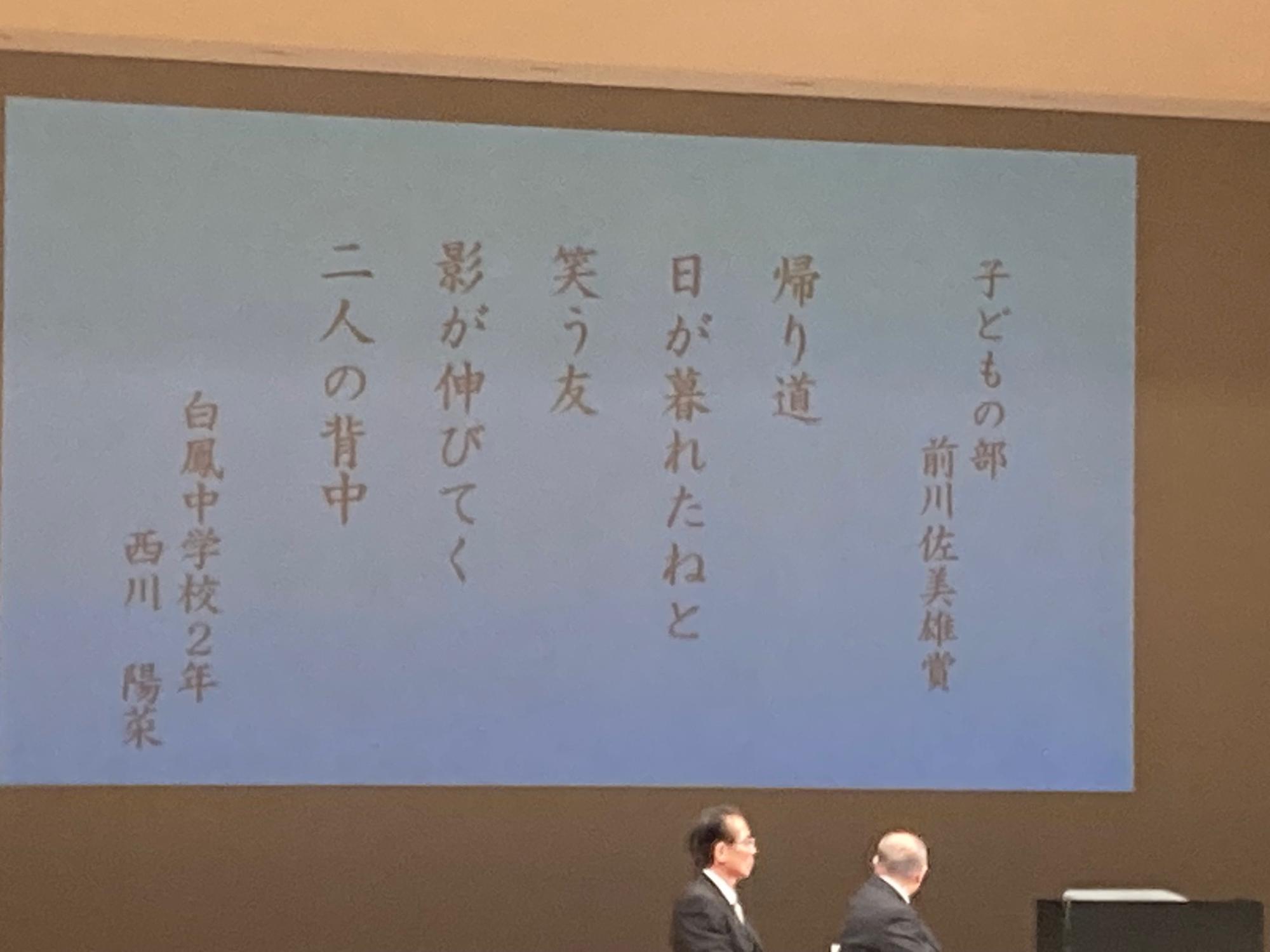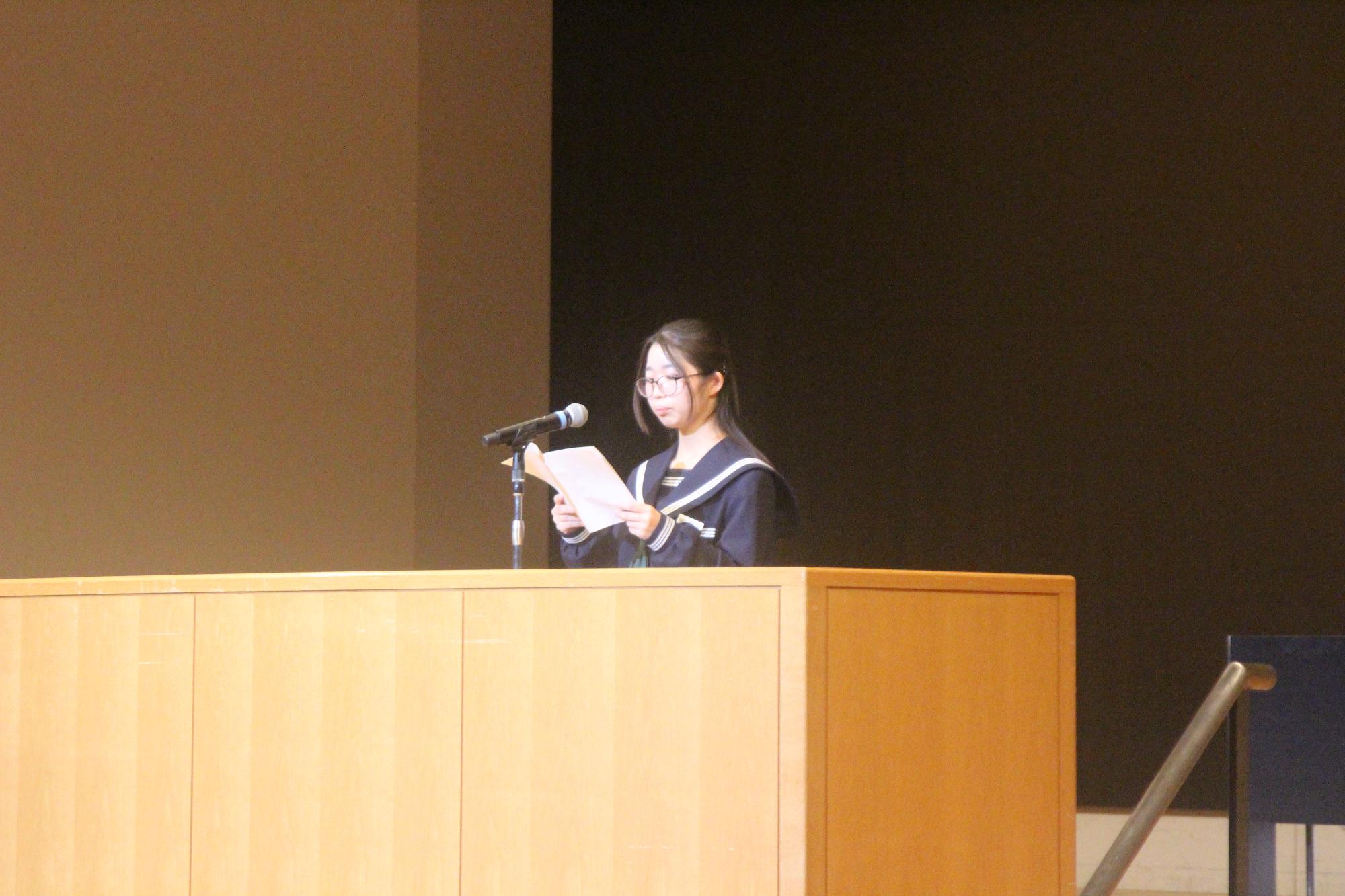11月15日(土曜日)新庄マルベリーホールにて葛城市文化祭が開催され、本校吹奏楽部の演奏、絵画部、ホームメーク部の作品展示が行われました。午後からは「秋の芸術・文化月間発表・表彰式」が行われ、英語スピーチ発表では、西田理恩さんの「My Dream(私の夢)」、作文発表では、尾上千莉さんの「親の温かさ」を二人とも緊張感の中にも堂々と発表を行いました。