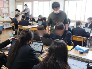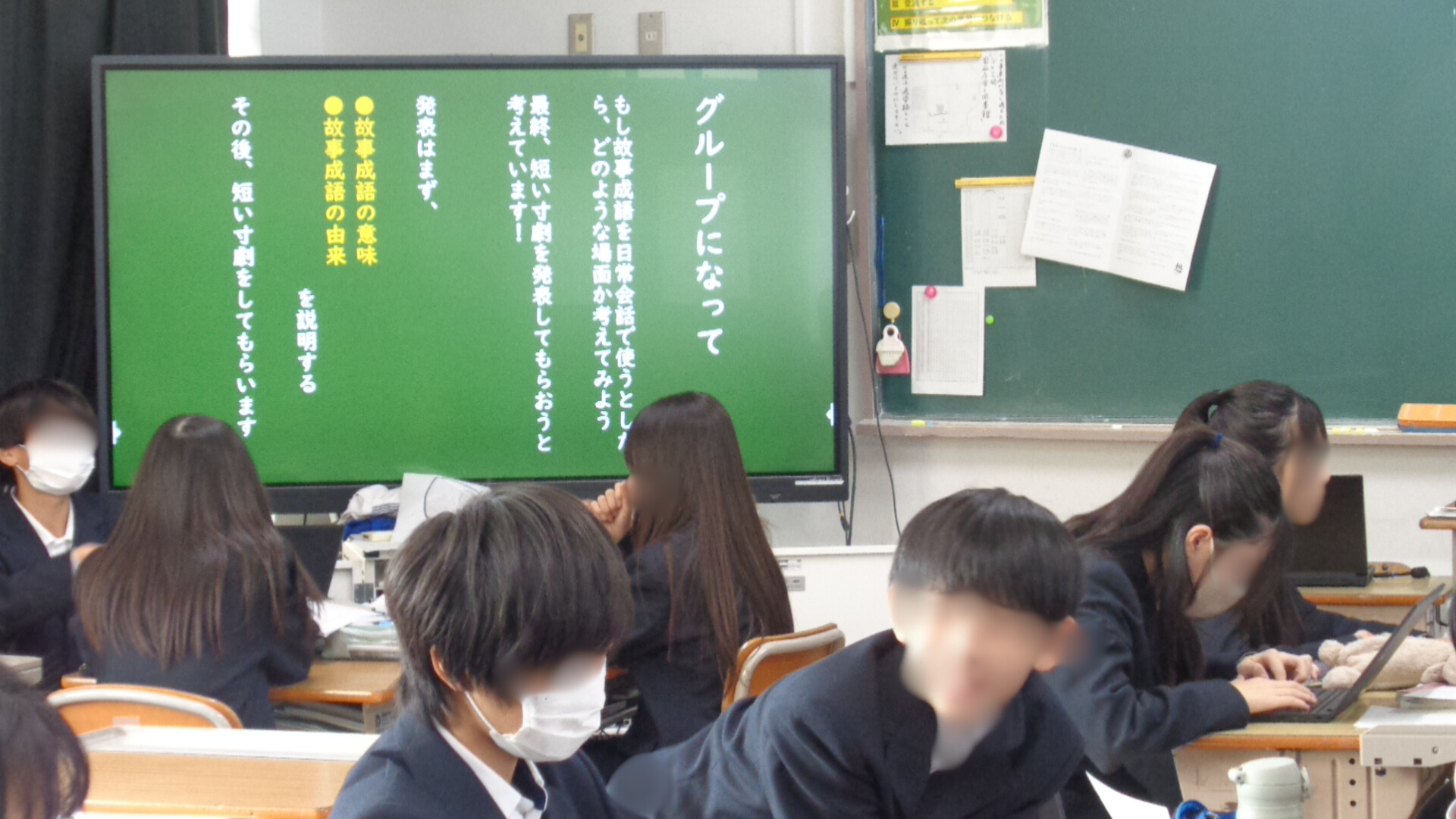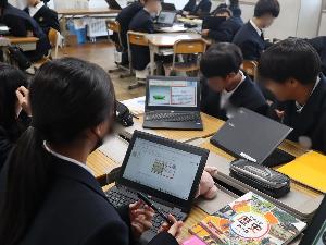 1年生で国語科校内研究授業を行いました。「今に生きる言葉」、故事成語の単元で故事成語の意味や由来を調べました。自身の経験と重ねて文章づくり、グループでその場面の寸劇のシナリオを作ることを目標に取り組みました。