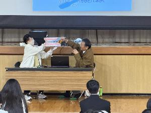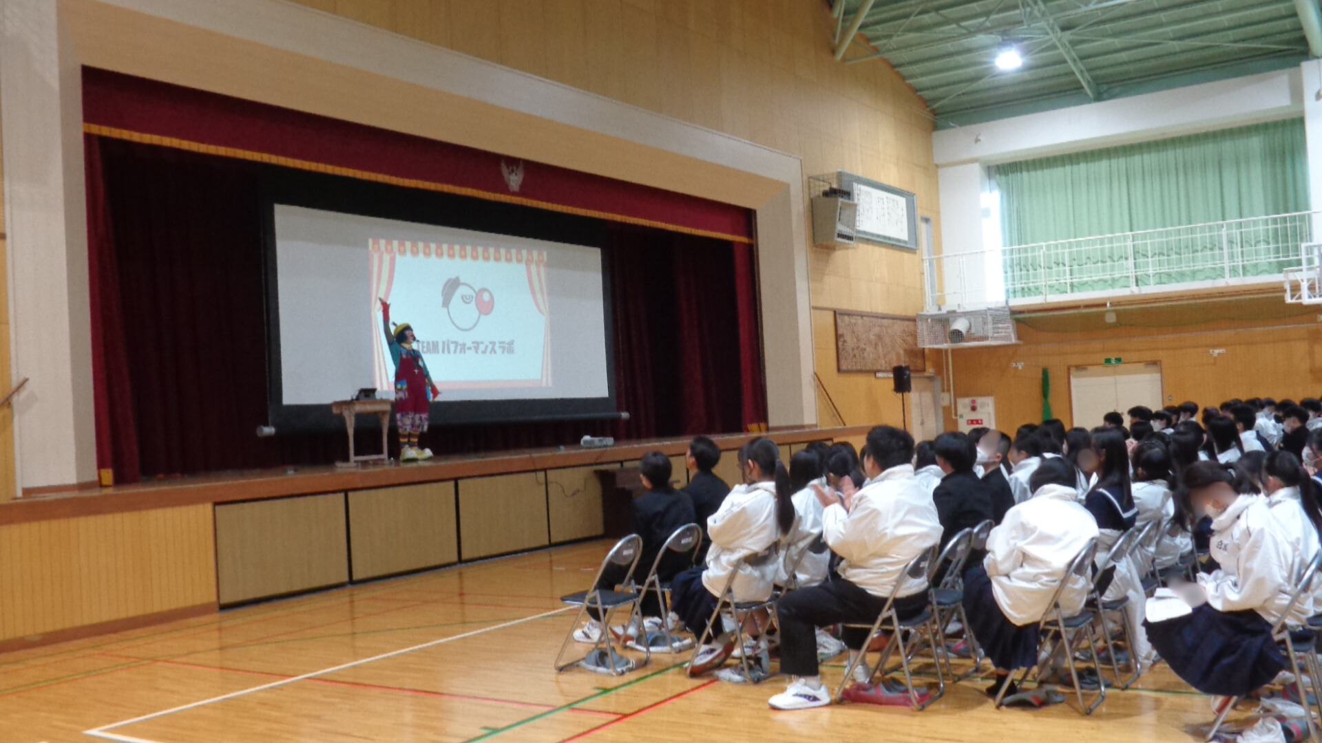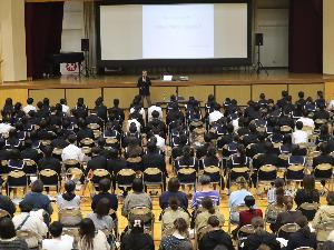 本年度教育講演会を本校体育館にて行いました。今年は、元・木下大サーカスのパフォーマーであるクラウンモッキーさんをお招きして、楽しいパフォーマンスと貴重な講演を聴かせていただきました。モッキーさんから「スタート地点は同じ」「短所をひっくり返してみる」「友達の夢を応援しよう」の3つのメッセージをもとにサーカス時代の貴重なお話を伺いました。パフォーマンスもとても楽しいものでした。