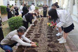 7月9日水曜日、環境美化委員会の生徒が学校コーディネーター、羽根康英さんの呼びかけにより交通事故で亡くなった男児が育てていたヒマワリの種を全国で咲かせ、交通事故根絶を訴える「ひまわりの絆プロジェクト」の一環で中庭のプランターにヒマワリの苗と種を植えました。