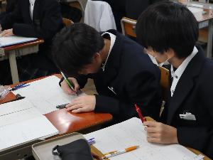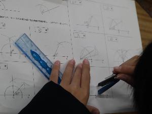 11月19日に1年生で数学科の校内研究授業を行いました。市教委教育アドバイザーにも参観いただき、「読み解く力の育成」を軸にして、グループ活動による学び合いによりこれまでに学習した方法で何種類の角度が作図できるかを、アイディアを出し合って考えました。「こんな方法があった」「できるかわからないけど、やってみよう」など、学び合いを通した「発見・分析・統合」の実践から活気のある学びができました。