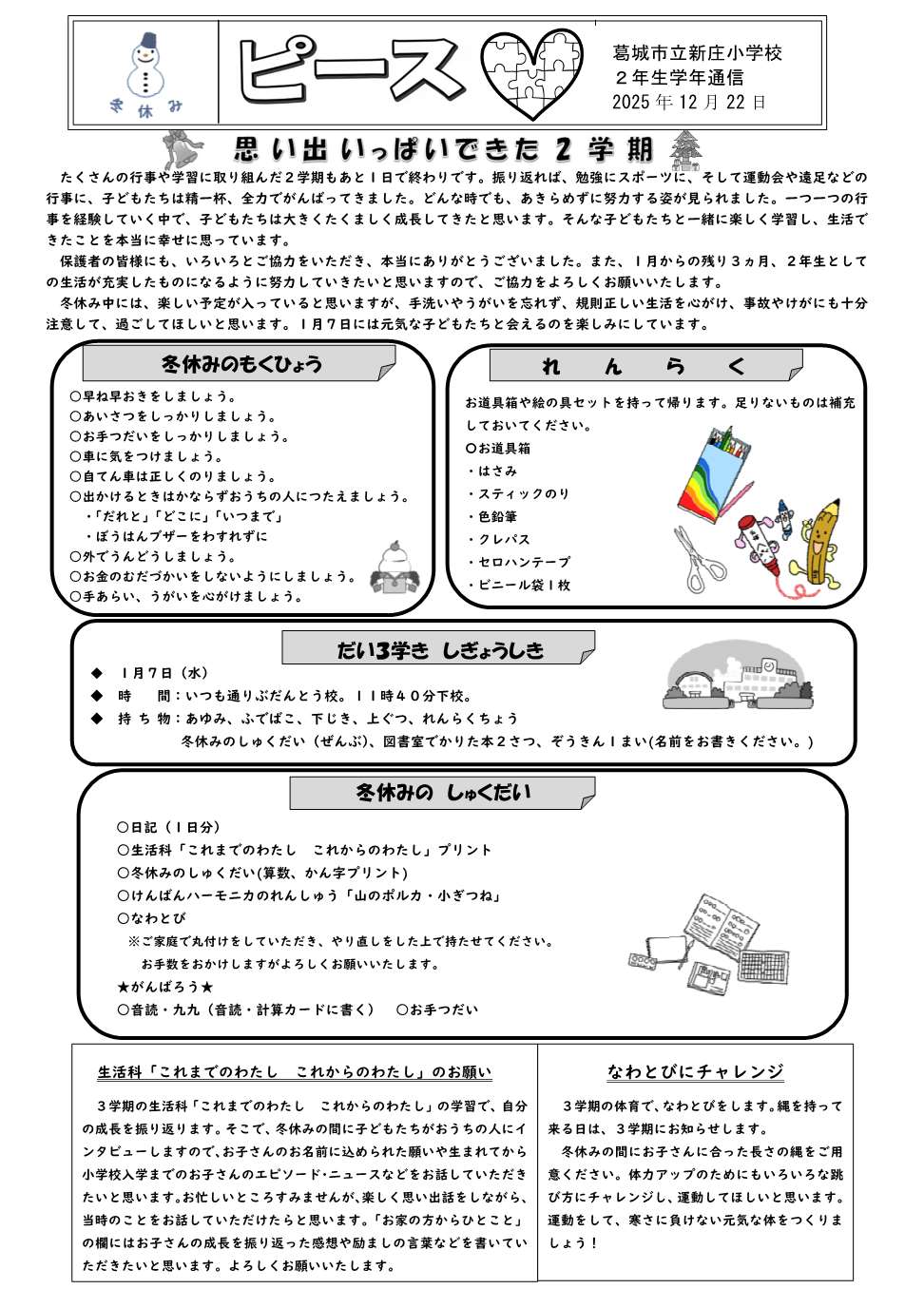 2年 学年だより最新号 これまでの学年だより 2年生4月号(PDFファイル:458.5KB) 2年生5月号(PDFファイル:456.6KB) 2年生6月号(PDFファイル:4.4MB) 2年生7月号(PDFファイル:435.4KB) 2年生夏休み号(PDFファイル:656.9KB) 2年生8・9月号(PDFファイル:557.6KB) 2年生10月号(PDFファイル:925.8KB) 2年生11月号(PDFファイル:520.7KB) 2年生12月号(PDFファイル:786.9KB) 2年生冬休み号(PDFファイル:662.1KB) この記事に関するお問い合わせ先 新庄小学校奈良県葛城市南道穂176番地1電話番号:0745-69-2131ファクス番号:0745-69-9277