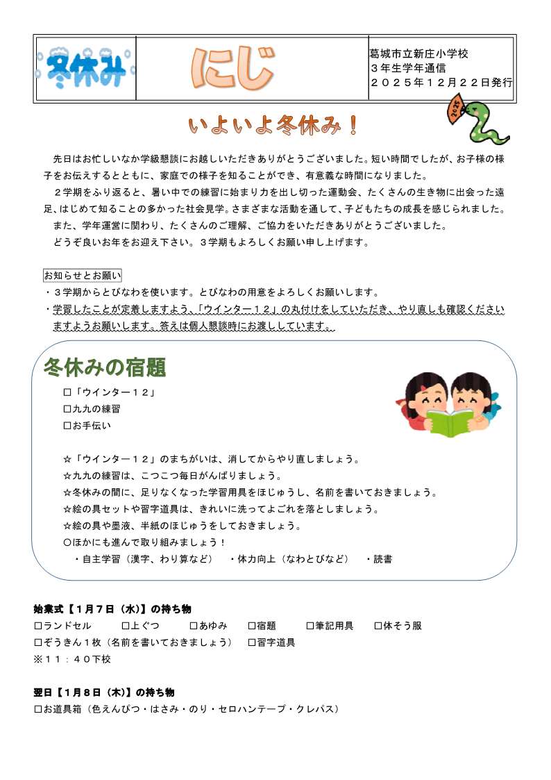 3年 学年だより最新号 これまでの学年だより 3年生4月号(PDFファイル:1.9MB) 3年生5月号(PDFファイル:1.6MB) 3年生6月号(PDFファイル:424.7KB) 3年生7月号(PDFファイル:1.1MB) 3年生夏休み号(PDFファイル:556.4KB) 3年生8・9月号(PDFファイル:912.1KB) 3年生10月号(PDFファイル:482.9KB) 3年生11月号(PDFファイル:4.6MB) 3年生12月号(PDFファイル:575KB) 3年生冬休み号(PDFファイル:363.5KB) この記事に関するお問い合わせ先 新庄小学校奈良県葛城市南道穂176番地1電話番号:0745-69-2131ファクス番号:0745-69-9277