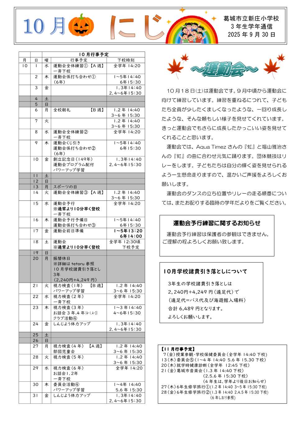 3年 学年だより最新号 これまでの学年だより 3年生4月号(PDFファイル:1.9MB) 3年生5月号(PDFファイル:1.6MB) 3年生6月号(PDFファイル:424.7KB) 3年生7月号(PDFファイル:1.1MB) 3年生夏休み号(PDFファイル:556.4KB) 3年生8・9月号(PDFファイル:912.1KB) 3年生10月号(PDFファイル:482.9KB) この記事に関するお問い合わせ先 新庄小学校奈良県葛城市南道穂176番地1電話番号:0745-69-2131ファクス番号:0745-69-9277