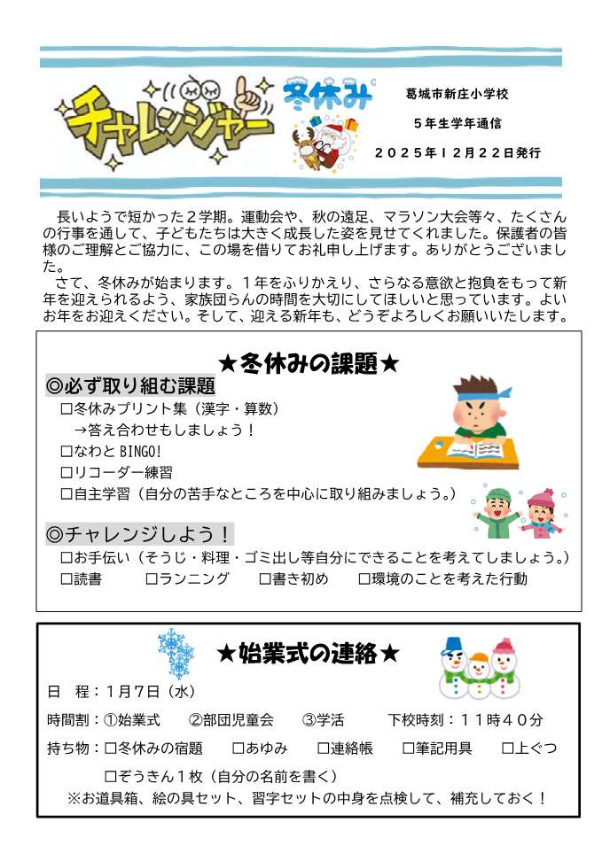 5年 学年だより最新号 これまでの学年だより 5年生4月号(PDFファイル:2MB) 5年生5月号(PDFファイル:1.5MB) 5年生6月号(PDFファイル:1.2MB) 5年生7月号(PDFファイル:925.5KB) 5年生夏休み号(PDFファイル:581.4KB) 5年生8・9月号(PDFファイル:1.2MB) 5年生10月号(PDFファイル:770.2KB) 5年生11月号(PDFファイル:1.1MB) 5年生12月号(PDFファイル:840.4KB) 5年生冬休み号(PDFファイル:604.2KB) この記事に関するお問い合わせ先 新庄小学校奈良県葛城市南道穂176番地1電話番号:0745-69-2131ファクス番号:0745-69-9277